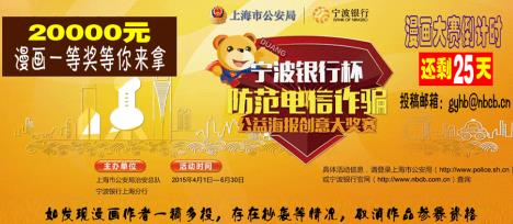 宁波杯漫画大赛邮箱:gyhb@nbcb.cn 内容是:电信诈骗,跟银行、犯罪有关的都行。这次奖金比较高,选取的多,评出机会就越大,详细内容在“天天漫画网”主页面上。祝你好运。
