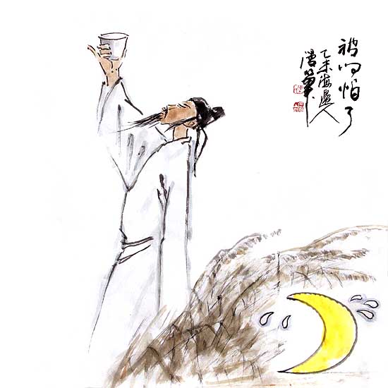 是晚与江浙,奋生两友畅饮至深夜3点,奋生说在我近期的作品中只更欣赏这幅《落叶面前诗人多》,因此作能令他脸发烫,并期望我能多创作出这类令人心震的画,此席话却令我脸红了。怀着反思而非不恭的心情再作诗人图。