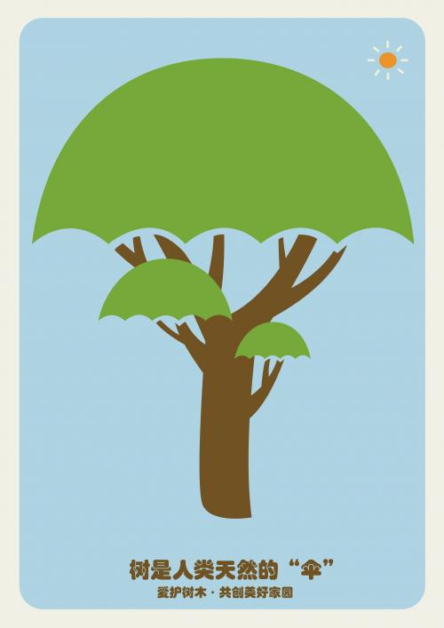 说明: 众所周知,“伞”的功能是为我们遮风挡雨遮挡炎热的太阳,伞和树都有“保护”的功能。该作品将树木浓茂的树冠巧妙的“替换”成伞,两者相呼应,传达出这样一个理念:树就是人类“天然的伞”,有树我们的世界才清凉。该作品通过这个比喻向人们呼吁应当保护树木,爱护我们的“天然伞”