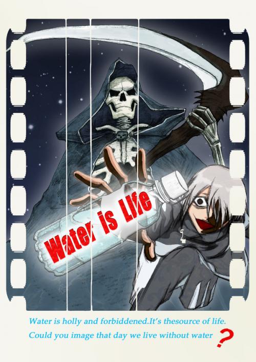 说明: 作品以“水是生命”的主题。背景星空,代表浩瀚的宇宙。骷髅代表死神,表达生命的结束。少年代表新生,是生命的体现。瓶中的水是主体,是生命的源泉。“水”以独有的形态存在于浩瀚的宇宙中,没有任何东西能代表它独有的地位。死神窥视着眼前发生的一切,“少年”的表情流露出对身后死神的恐惧,“少年”奔向“水”体现“少年”对生命延续的珍视。