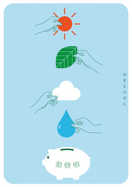 说明: 我们通常将钱储蓄起来留给以后用。该作品用“储蓄”这个道理向人们呼吁:我们应当将美好的世界储蓄起来留给我们的子孙后代;人们不应当只顾眼前利益而过度的污染、砍伐、攫取、浪费,而是通过提高自身的意识去防治、节约、保护、奉献,这样才能留给子孙后代美好的明天,才能真正的走可持续发展道路。
