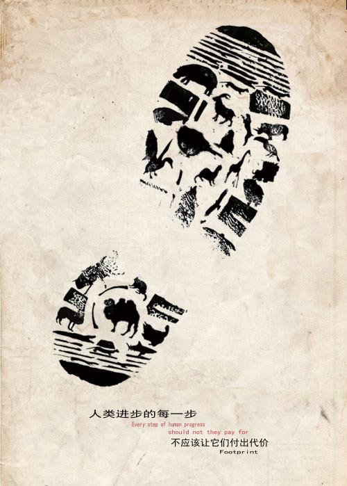 说明: 项目目标:使人们意识到不应该因为我们的进步而让动物失去食物,生存环境等代价,倡导人类与动物和平相处.保护动物. 背景信息:随着人类的进步,动物遭到的迫害已经越来越严重.我们不应该再只顾自己的进步而让它们出代价. 解决方案的独特性和创新手段:脚印代表前进后留下的痕迹,我用来表达人类的进步.而脚印还代表被踩过的痕迹,而被踩过的物体是遭受过破坏和毁灭的.将两个意义巧妙的融合,以脚印为轮廓中间加以动物的剪影形成作品《足迹》,表达在人类进步的同时本应该和我们共同生存的动物们也被我们破坏.强调出人类的进步不应该踩在它们的尸体上,人类进步的每一步,都不应该让它“们付出代价”.