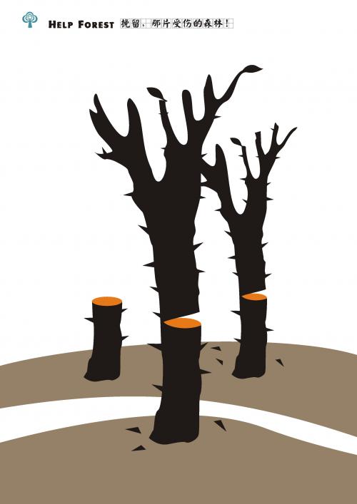 说明: 树木为了生存,生长出树刺,想通过树刺保护自己;通过正负形的手法,手伸向树木;砍伐的树木,大地暗黄一片,千疮百孔。