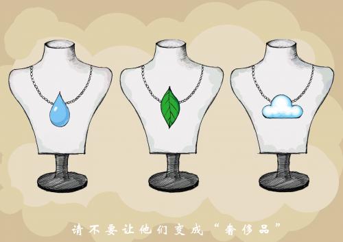 说明: 人类对动物的捕杀使得许多动物变成了名贵的“稀有动物”,同样,如果人类肆无忌惮的攫取自然资源,再加上对环境的污染与破坏,那么像“水”“森林”“绿地”“蓝天”这些普遍存在的自然事物也因不断减少而变成人类的“奢侈品”。该作品逆向思维,呼吁人类保护自然、珍惜资源,不要让这些常见的自然资源变成了我们的“奢侈品”