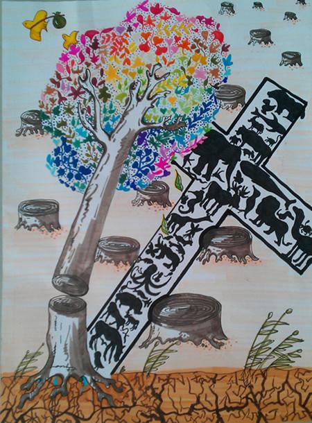 说明: 由下往上:干裂的土地,大树即将吮吸完那最后几滴生命之水;枯草在随风摆动,它们已无力抵抗;随着远处树木一颗颗倒下,终于轮到这最后的一颗,在最后一抹鲜艳的色彩即将倒下的同时,地上投下由各种即将灭绝的动物组成,沉重的十字架影子……这一切一切都是对人类的警示,森林与绿色未来,需要我们全民携手呵护。若不这样,就要付出沉重的代价!