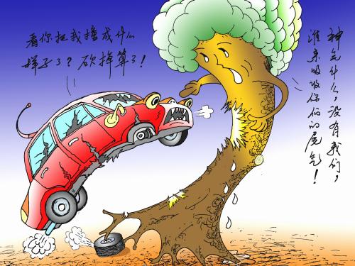 说明: 漫画《不撞不相识》以一起汽车撞树事故为题材,通过二者的对话揭示了森林在环境保护中的重要作用(吸收二氧化碳等有毒气体,如汽车尾汽等),既能净化空气,又能降低温室效应,从而对读者起到启发教育作用。