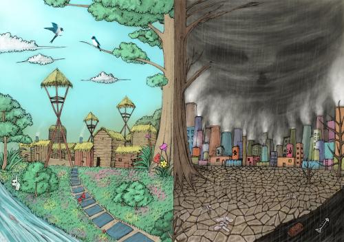 说明: 作品采用时间顺序反映出了,以前与现在环境的强烈对比、在以前蓝色的天空,绿色的花园,清清的流水。各种鸟儿,鱼儿也呈现出了生机勃勃的局面。随着时间的流失,各种工厂的搬迁,环境出现了翻天覆地的变化。蓝色天空被取而代之的是酸雨,沙尘暴。沙尘暴也即将吞噬着这整座城市。空气中增加了很多化学物质,各种生物也变成了一堆白骨。同一棵树木也经历了由生到枯死的过程。所以,为了人类的生存环境,我们应该深刻反省。