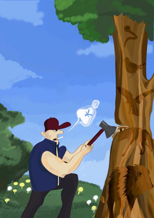 作品说明:这是一副独立的插画,以乱砍乱伐为主题。本画通过树木上映现的动物形象,让人了解到乱砍伐树木会破坏一些动物的食物链,就间接消灭了那些动物,所以你砍得不是树。