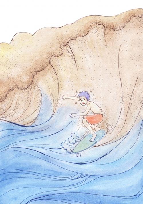说明: 一个男孩在海上冲浪,海浪渐渐变成沙子涌向男孩,男孩很惊慌。这表现了自然环境受到人类肆意的破坏,沙漠化日益严重,不容忽视,呼吁人们爱护大自然。