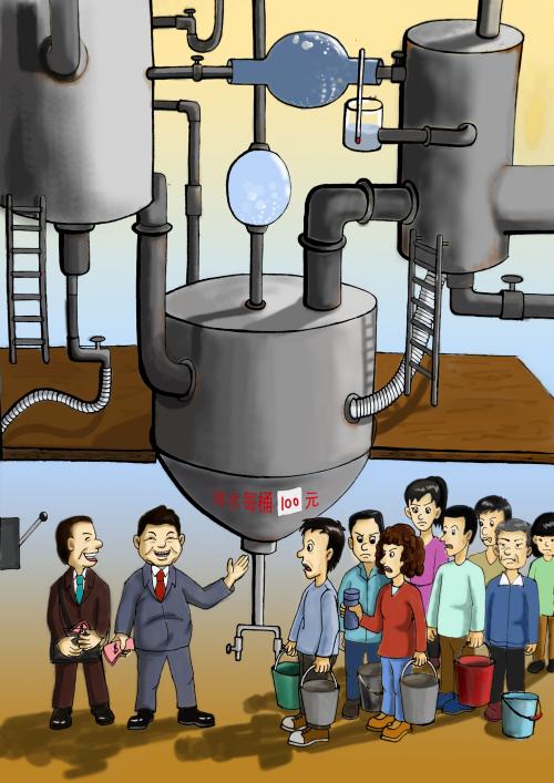 说明: 水都被污染了,人们喝不上清水,有些奸商净化了水后高价卖给人们。