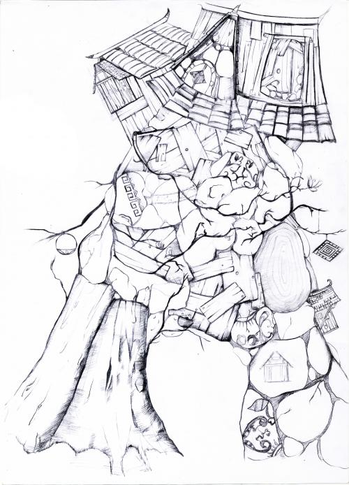 说明: 本作品以原始材料为基调,将环保的精神注入作品,意图表现回到最原始、最自然的环境之中。