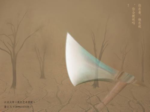 说明: 黄土漫天 ,远处明显已风化的山体时隐时现。一把斧头袒露在画面中,体现出人们自己做下的事最终还得自己负责。以此告诫人们,植树造林,保护绿色是我们每个人应有的责任。