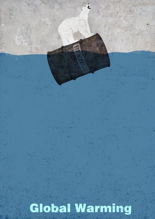 说明: 作品描绘一只哀嚎的熊踩着汽油桶在海面上飘荡。众所周知:汽油的燃烧产生大量二氧化碳及其他有害气体破坏环境导致全球变暖、冰川融化、海平面上升;冰川融化,北极熊无家可归。该作品极具讽刺意味:北极熊踩着汽油桶,而汽油桶恰恰是使它无家可归的“元凶”。该作品通过刻画北极熊的哀嚎,呼吁人们应当采取措施保护环境,不要让悲剧发生。