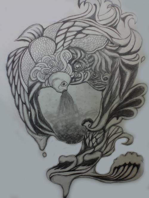 说明: 这幅画采用人的头部作为主体,人鱼结合,暗示人和鱼一样需要美好的生存、生活环境,人类要珍爱自然、生物,人与自然要和谐相处。这幅画的上半部分画出了一条一直被污水困扰的、身披祥云的、象征美好的鱼,它想张开双翅,摆脱这恶劣的生存环境,飞向它右上方的那片它心中的美丽的海洋,但却变成了人类排放污水废气的下水道。中间部分也就是人的面部是一个污水排放集中营,暗示现在的人们不顾生存环境,只为积极效益,变得越来越恶心。右下方则是一个污水处理器,希望人们能够早日看清现实,节能减排,废物再利用,还鱼一个安全的生存环境,给自然一次美丽,换人们一片光明。