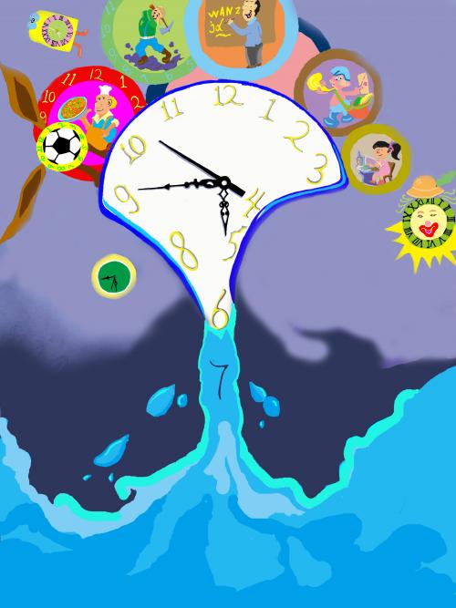说明: 我画的这幅画主体是画了一块只有一半的钟,钟上的时间流了小半,变成了水,钟的下半身波涛汹涌的流水奔腾远行!寓意时光飞逝,日月如梭。 这幅画的第一映像可以给人很清晰的看出都和时间有关,从钟上可看出荏苒的时光就这样悄悄地,慢慢地消逝了,如流水一样,一去不复返。鲁迅先生说过:生命是以时间为单位的,浪费别人的时间等于谋财害命;浪费自己的时间,等于慢性自杀。因此我们要在有限的生命里,珍惜时间、节约时间,充分利用好时间,把握每一分一秒来做一些有意义的事,这样我们的人生才能像钟一样的有价值。