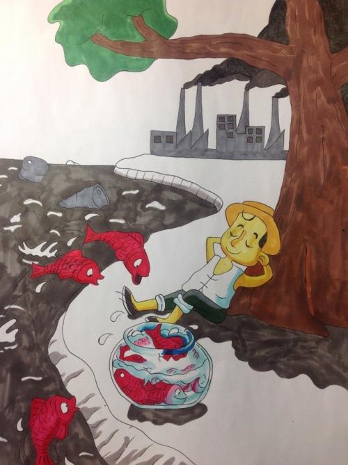 说明: 作品用一种诙谐幽默的手法表现了:河水被工厂污染,鱼都跑到浴缸里了,所以守株待兔
