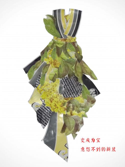 说明: 此作品中,是一件由生活中的一些易拉罐、掉落的花瓣叶子构成的一件礼服。想通过这种手工拼贴的方式,表达每一件事物除了其可视性价值之外,还可能拥有其他不止一种价值。用心去发现事物的第二次价值,其实就是给了它们一次再生的机会,你也可能得到意想不到的收获。我们都希望能一直体现自己的价值,换位思考,事物也是。环保或许也需要这样的理念支撑。