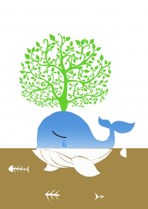 说明: 鲸鱼本来是海洋霸主,可当环境越来越恶劣,海洋里的所有生物都生存不下去变成了一堆白骨,它就什么都不是了,甚至还要为了生活努力。下半身为了做植物的养分都变成了白骨,本来喷水的地方种上了树。它能做的只有这些了,但是它不知道自己还能撑多久想到这里它流下了眼泪。