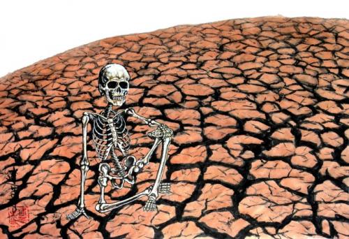 说明: 一个骷髅坐在地上,手里还拿个空饮料瓶,凝视着远方。环境遭到破坏,水资源流失,最后一滴水也没有啦,人类只有坐以待毙。快保护我们的环境吧!