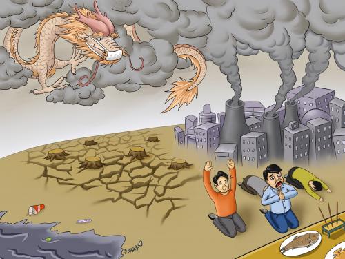 说明: 海洋污染,龙王无家可归,大气污染,龙王戴上口罩无法降雨,干旱,人们求雨……无限循环