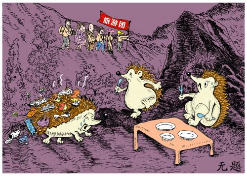 说明: 本漫画讽刺某些地方旅游资源过度、盲目开发,严重破坏环境资源,对生态环境造成的严重损害。