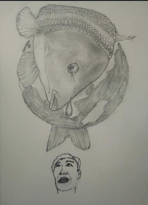 说明: 一条快死去的鱼儿留着泪水躺在污染严重的地球上,它的泪水是地球上最后的淡水,一个人张着嘴等待着喝那滴淡水。