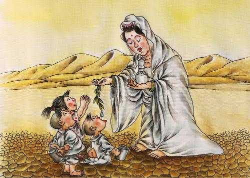 说明: 用神话故事表现远方的沙漠、干旱的大地上只剩下菩萨手中甘露水,干渴的孩子只能默默的等待救命的——水。人类已经无法生存下去。龟裂的大地是人们破坏环境以至于地球不在生机勃勃