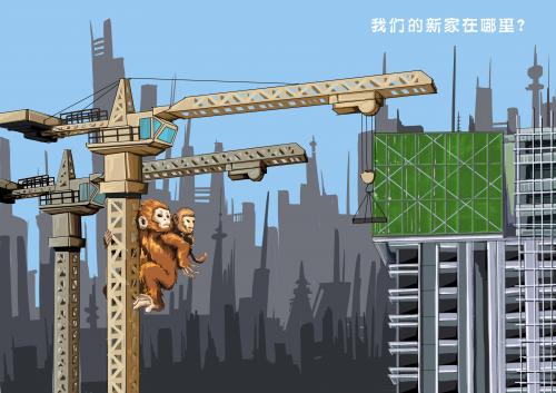 说明: 该系列作品以建筑工地为背景。人类为了扩张城市规模,给自己修建家园,却大肆侵占自然空间、破坏绿地、侵占动物家园,这个系列作品就以从不同的动物视角出发,通过强烈对比,来表达:人们修建家园不应该侵占动物们的家园,进而呼吁人们,人与自然应该和谐发展。