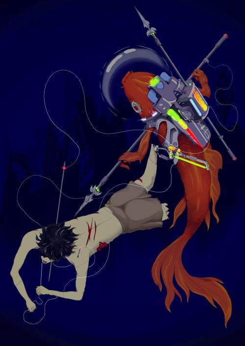 说明: 气候变暖,冰川融化,城市沉入海洋。鱼类穿上高科技设备像从前人类捕杀它们一样捕杀人类。